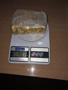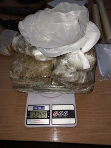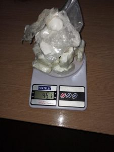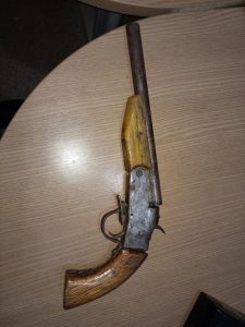O indivíduo confirmou tai informações e franquiou a entrada da guarnição do PATAMO em sua residência. Durante as buscas foram encontrados mais uma arma de fogo tipo garrucha, drogas sendo, 407 gramas de crack, 450 gramas de cocaína, 2.249 quilos de maconha, 5 rolos de papel filme, várias embalagens de plásticas utilizados para embalar a droga para a venda, 3 balanças de precisão entre outros objetos.