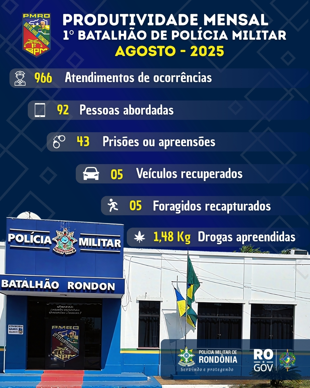Na manhã desta quinta-feira (11), em Porto Velho, o 1º Batalhão de Polícia Militar de Rondônia apresentou o levantamento da produtividade referente ao mês de agosto, trazendo números relevantes para a comunidade residente na área de atuação da unidade.