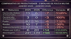 Dados comparativos de produtividade do 3º Batalhão da Polícia Militar no Cone Sul do Estado entre janeiro de 2025 e janeiro de 2026, apontam redução nos principais crimes contra a vida e o patrimônio, ao mesmo tempo em que registram aumento significativo nas ações policiais e nas prisões por tráfico de drogas.