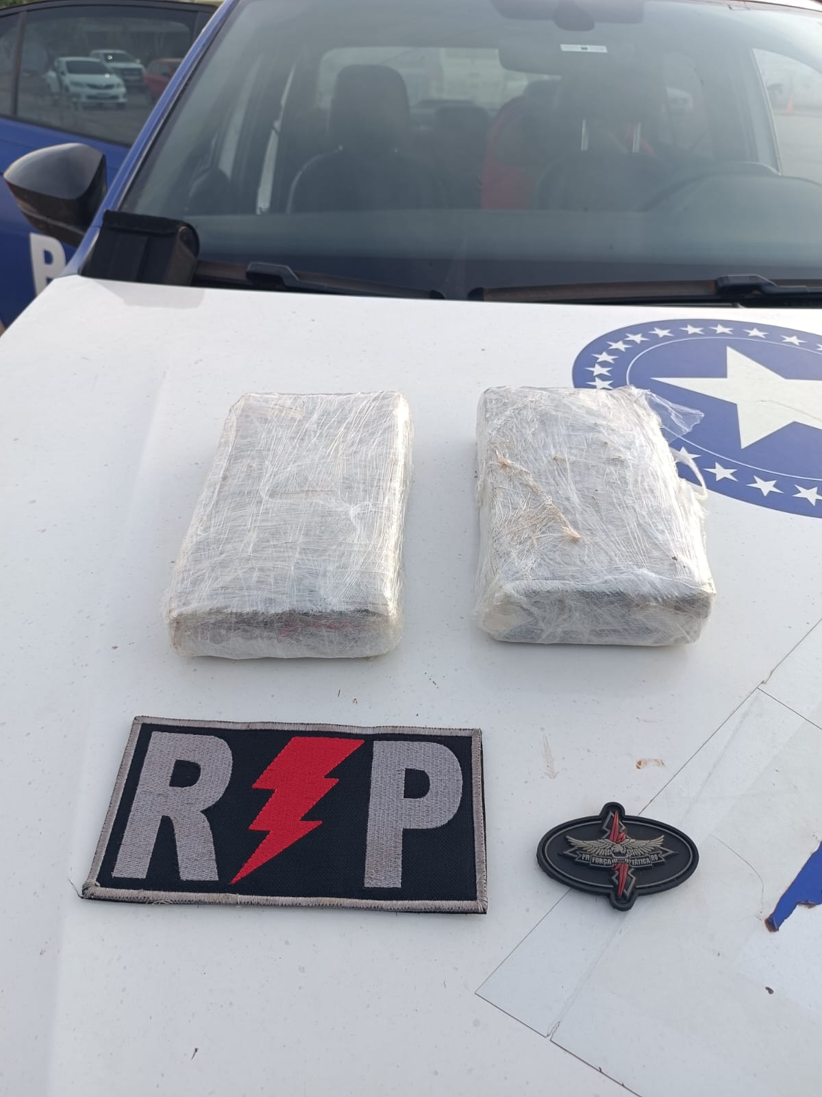 Durante a revista no veículo, foram encontrados dois tabletes de uma substância entorpecente que, segundo ele, era maconha, com um peso estimado de 2 kg e valor de R$ 1.000,00. O suspeito, no entanto, se recusou a informar a identidade de seu fornecedor.
