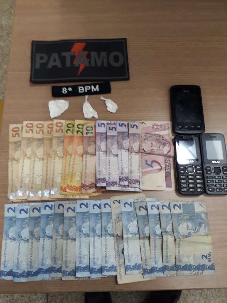 Após abordagem foi encontrado com o suspeito, três invólucros com uma substância com aspecto de cocaína, três celulares e uma quantia em dinheiro. Diante do exposto o suspeito foi encaminhado para a realização dos procedimentos legais.