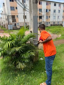 Durante a atividade, foram realizadas intervenções em pontos estratégicos do residencial, com a cobertura de pichações e recuperação visual dos espaços, proporcionando um ambiente mais organizado e acolhedor para os moradores.