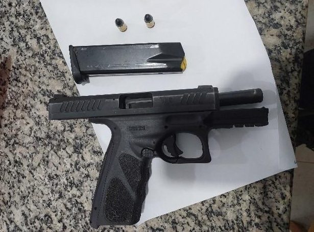 Na revista realizada nos veículos, os militares localizaram, na porta dianteira do lado direito da caminhonete Hilux, uma pistola marca Taurus, modelo TS9, calibre 9mm, que estava dentro de um coldre, com uma munição na câmara e outra no tapete do veículo. O condutor apresentou documentação que comprovava o registro da arma, mas negou ter efetuado disparos.