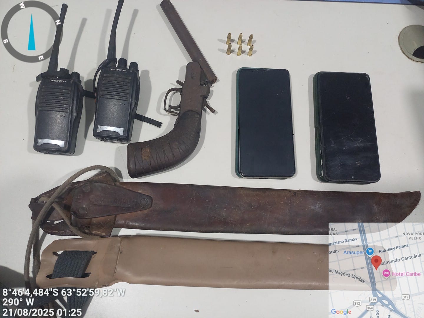 No local, a guarnição foi recebida por um oficial da PM, que conduziu os agentes até onde os suspeitos já estavam detidos. Três dos envolvidos foram autuados por porte ilegal de arma, enquanto um quarto foi preso em flagrante também por estar transportando madeira irregular — aproximadamente 3,98m³ de lascas, conforme levantamento inicial.