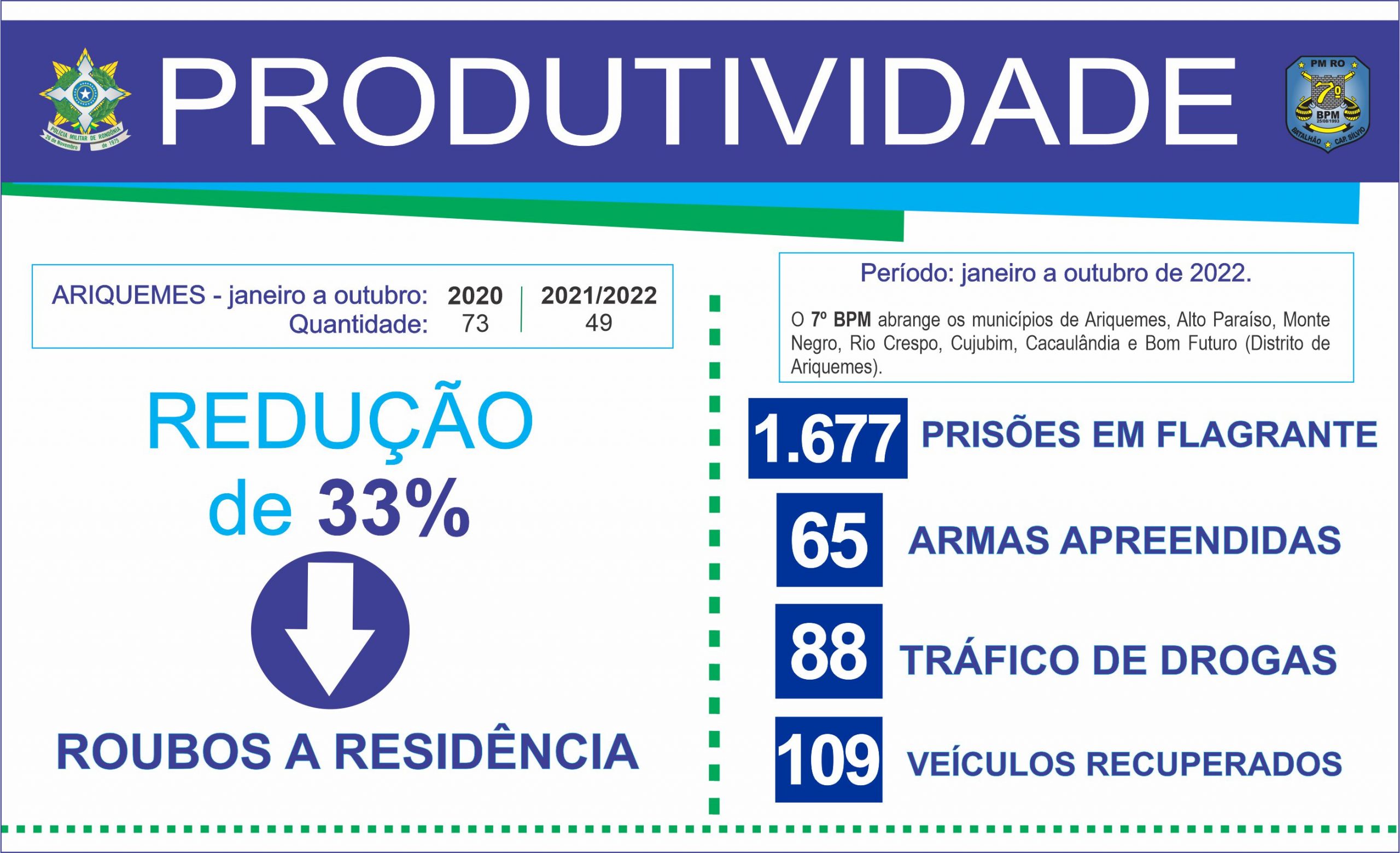 A área de atuação do 7º BPM abrange os municípios de Ariquemes, Alto Paraíso, Monte Negro, Rio Crespo, Cujubim, Cacaulândia e Bom Futuro (Distrito de Ariquemes). De janeiro a outubro deste ano o Batalhão retirou de circulação 65 armas de fogo ilegais, prendeu quase cem pessoas pelo crime de tráfico de drogas, recuperou mais de cem veículos e prendeu em flagrante mais de 1.500 pessoas cometendo crimes.
