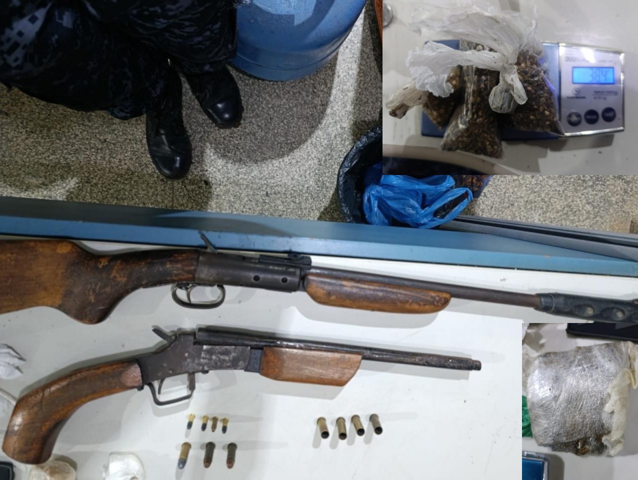 Durante a ação, o morador apresentou-se espontaneamente e indicou a existência de entorpecentes e armas no interior da residência. Em buscas realizadas de forma segura e metódica, os policiais localizaram diversas substâncias entorpecentes, entre elas cocaína, crack, maconha e pasta base, além de armas de fogo, munições, balanças de precisão, dinheiro em espécie e materiais utilizados no fracionamento e preparo das drogas. No local, também foi encontrada uma motocicleta em estado de desmanche, posteriormente identificada como produto de furto ou roubo, além de outros objetos sem comprovação de origem lícita.
