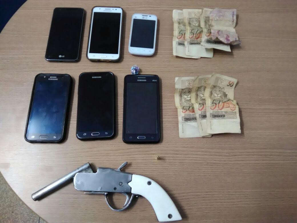 Em posse dos suspeitos foram encontrados seis aparelhos celulares, cerca de R$ 305,00 reais em dinheiro e uma arma de fogo calibre .22, possivelmente uma garrucha de fabricação artesanal com o cabo na cor branca, contendo uma munição intacta.