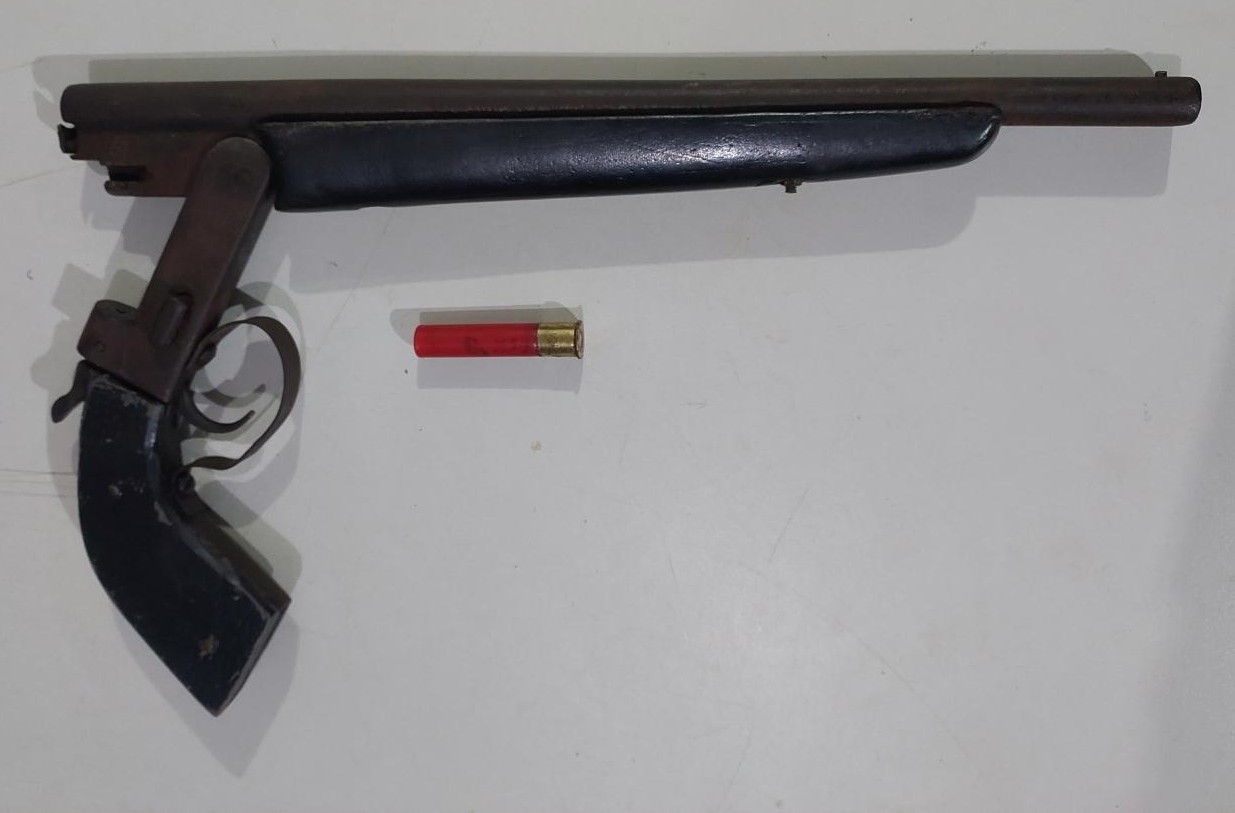 Diante da fundada suspeita e da informação prévia repassada, os militares realizaram o acompanhamento imediato e procederam à averiguação no imóvel, agindo com técnica e observância aos protocolos operacionais. Durante as buscas, foi localizada sobre a tampa de um poço uma escopeta artesanal, calibre .36, municiada com uma munição intacta, sem marca de fabricante ou número de série aparente. Questionado, o conduzido declarou que mantinha a arma para defesa pessoal, afirmando que não estaria ameaçando ninguém.