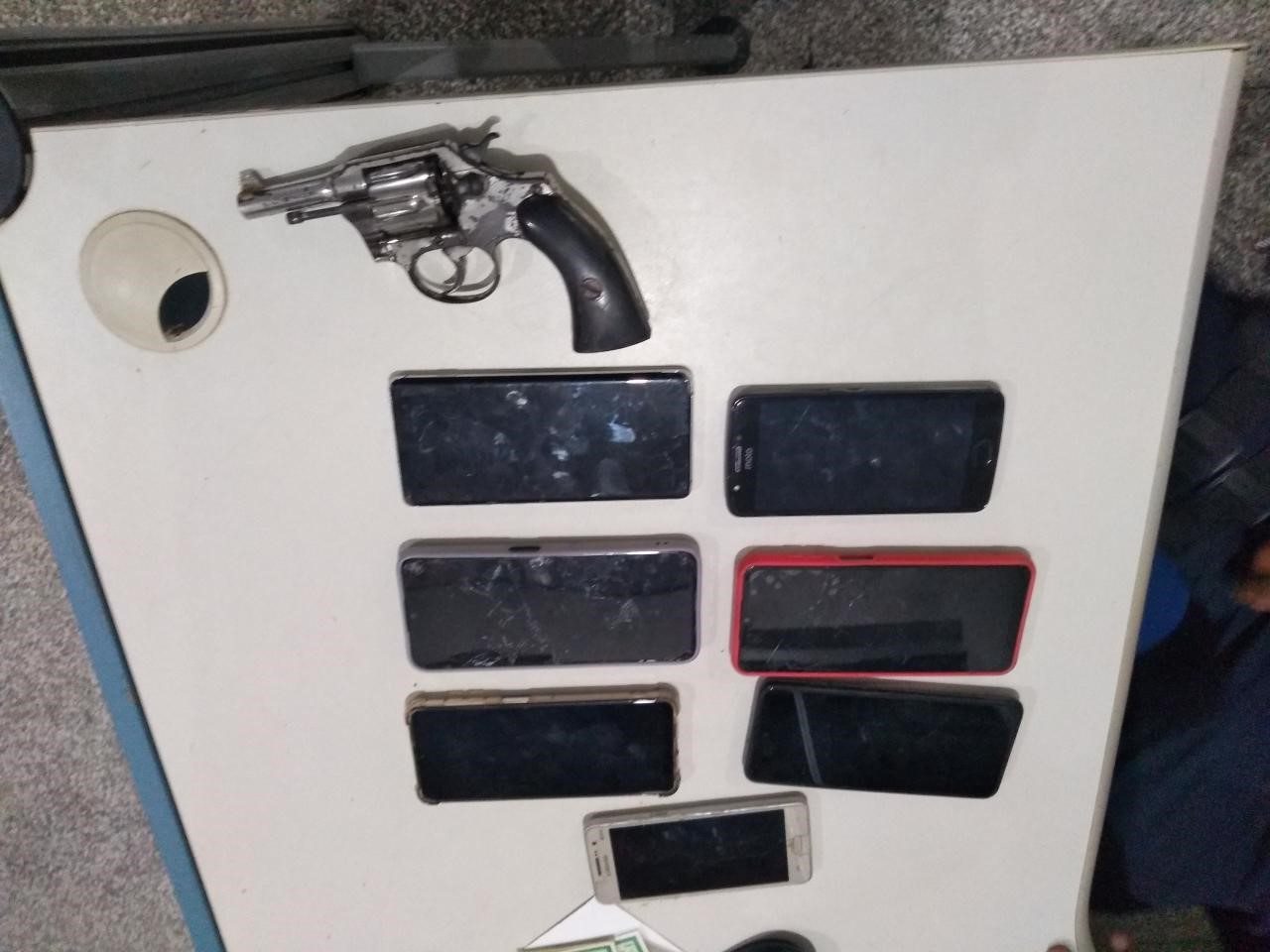 Com a dupla havia uma arma de fogo do tipo revólver e sete aparelhos celulares. Diante do flagrante, a guarnição de serviço conduziu os infratores, um de 20 anos e um de 25, um deles portava uma tornozeleira de monitoramento e essa estava revestida de papel alumínio.