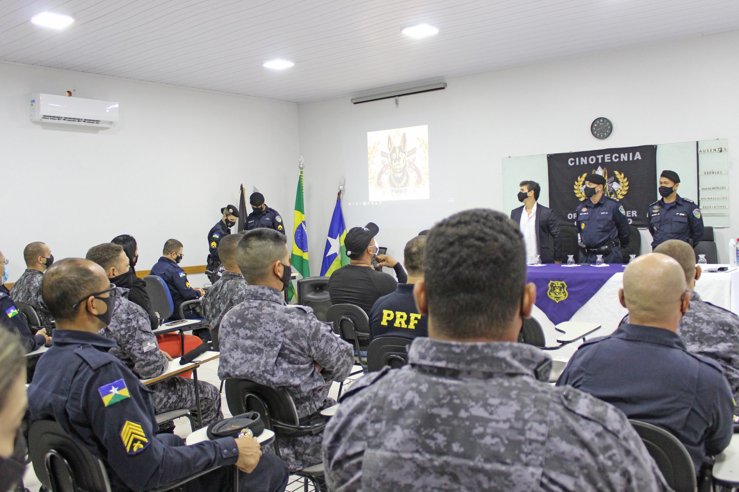 A aula inaugural teve início com o palestrante Coronel Veterinário, Anderson, onde foi destacada a história dos primeiros canis da PMRO e um breve histórico do policiamento com cães na Corporação.