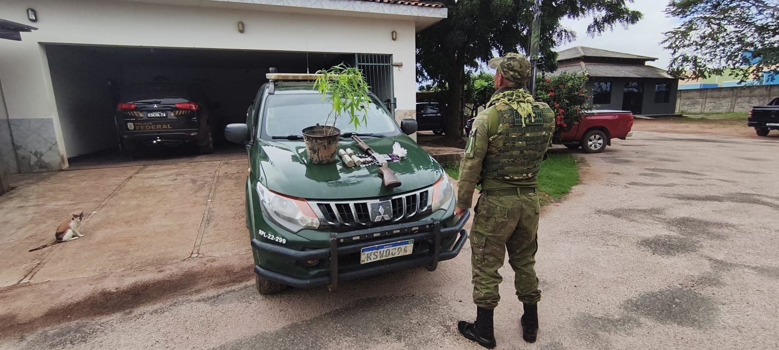 Durante as diligências no local, as equipes localizaram uma espingarda calibre 12, três munições do mesmo calibre, escondidas sob uma cama, além de quatro granadas com marcas e numerações ilegíveis, enterradas no quintal da residência. Também foi encontrado um vaso com três pés de maconha, bem como porções de maconha e cocaína, uma balança de precisão e seis aparelhos celulares.