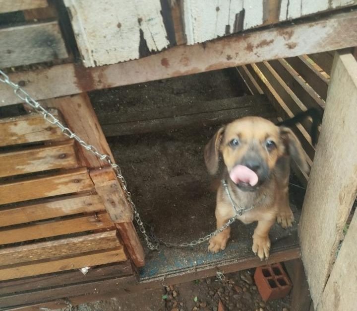 A guarnição policial se deslocou até o endereço indicado e, após autorização para entrada no imóvel, constatou a presença de três cães em situação irregular. Um filhote estava preso em uma estrutura improvisada semelhante a um galinheiro, dividindo espaço com aves, em ambiente sem condições adequadas de higiene e separação entre espécies.