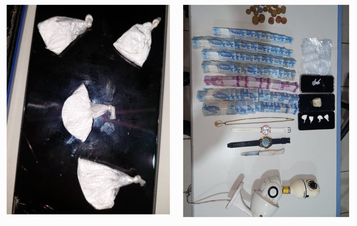 Foi realizado acompanhamento tático, logrando êxito em abordá-lo já dentro do imóvel. Durante a busca pessoal, foram encontrados em sua posse quatro invólucros de substância aparentando ser cocaína, um invólucro de substância aparentando ser maconha e uma quantia considerável de dinheiro trocado.
