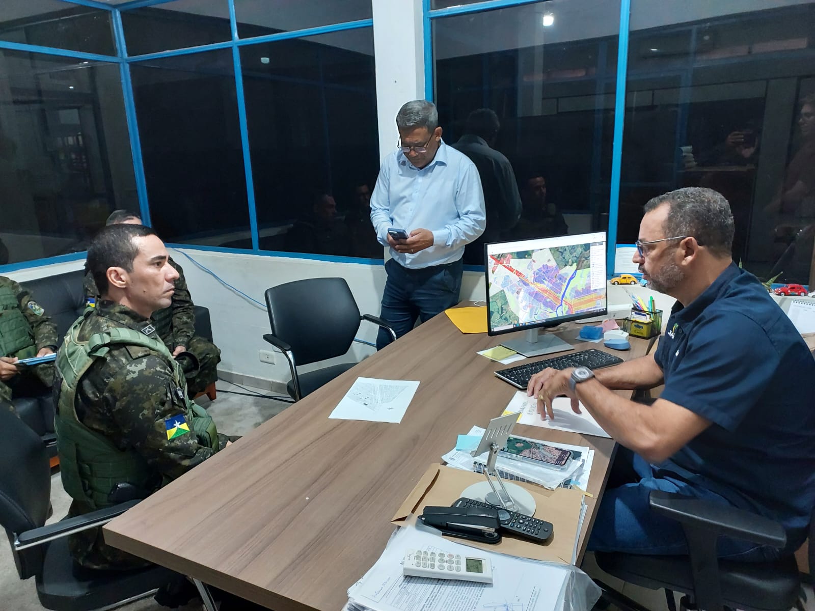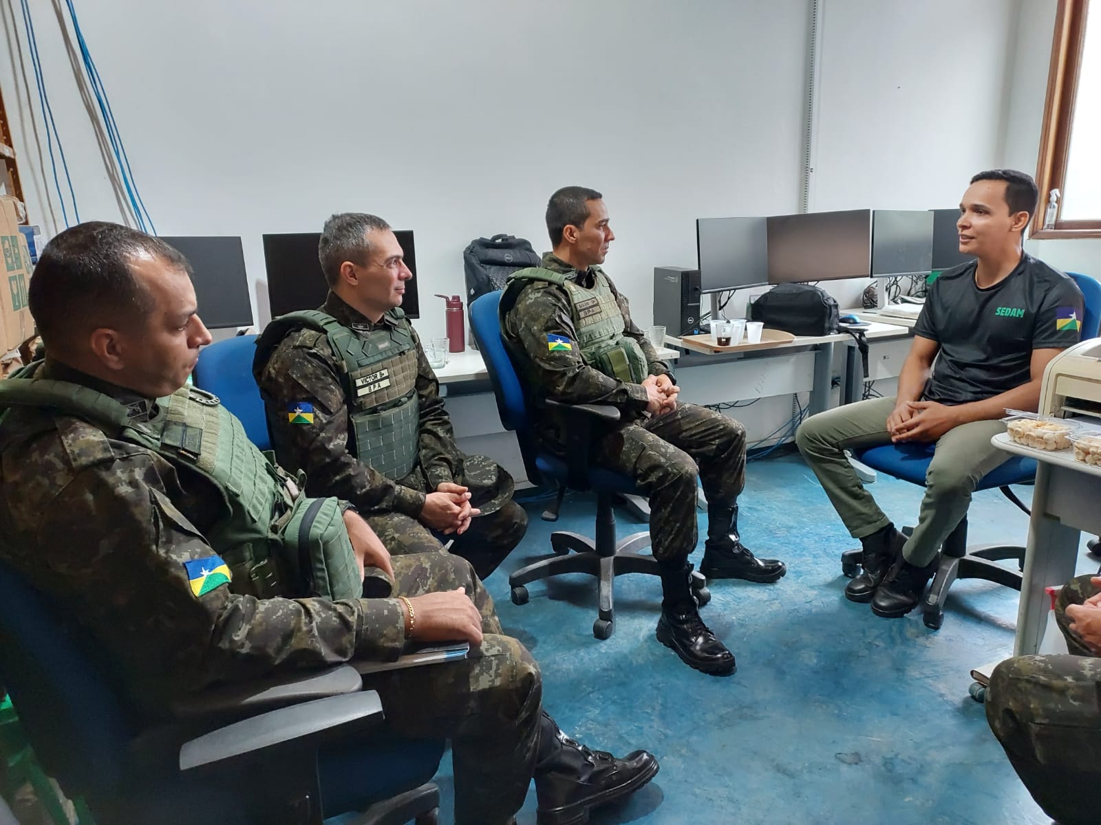 Comando do Batalhão de Polícia Ambiental durante reunião institucional com servidores do ICMBio e do IBAMA em Ji-Paraná.
