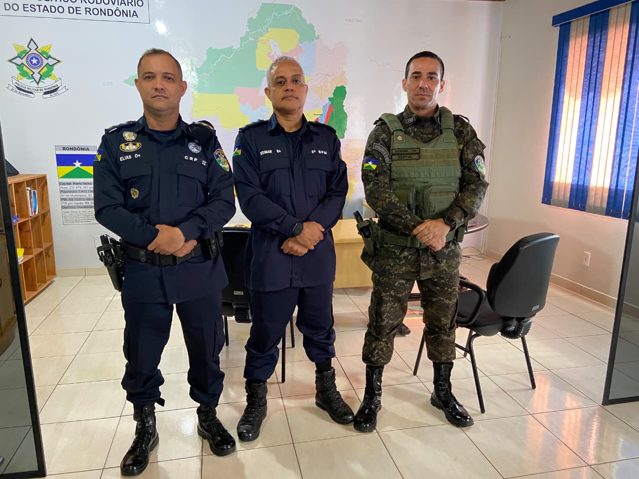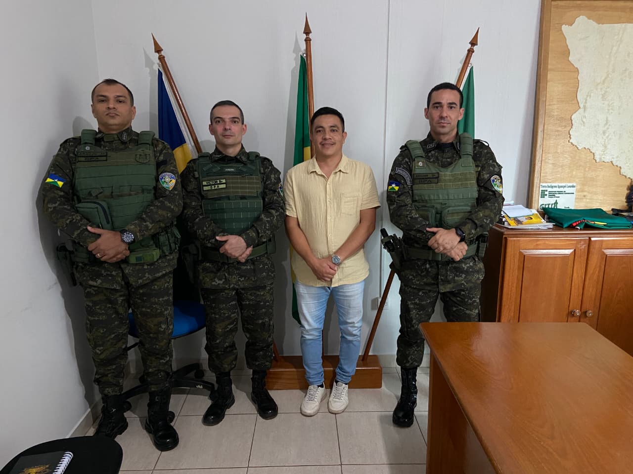 Na sequência, o comando do BPA realizou visita à Secretaria Municipal de Regularização Fundiária e Habitação de Ji-Paraná, sendo recepcionado pelo senhor Antônio Marcos dos Santos, secretário municipal da pasta, juntamente com o senhor Lourenil Gomes da Silva, vereador do município. Durante o encontro foram debatidas pautas relacionadas à regularização fundiária, ordenamento territorial e iniciativas voltadas à preservação ambiental e ao desenvolvimento sustentável da região.