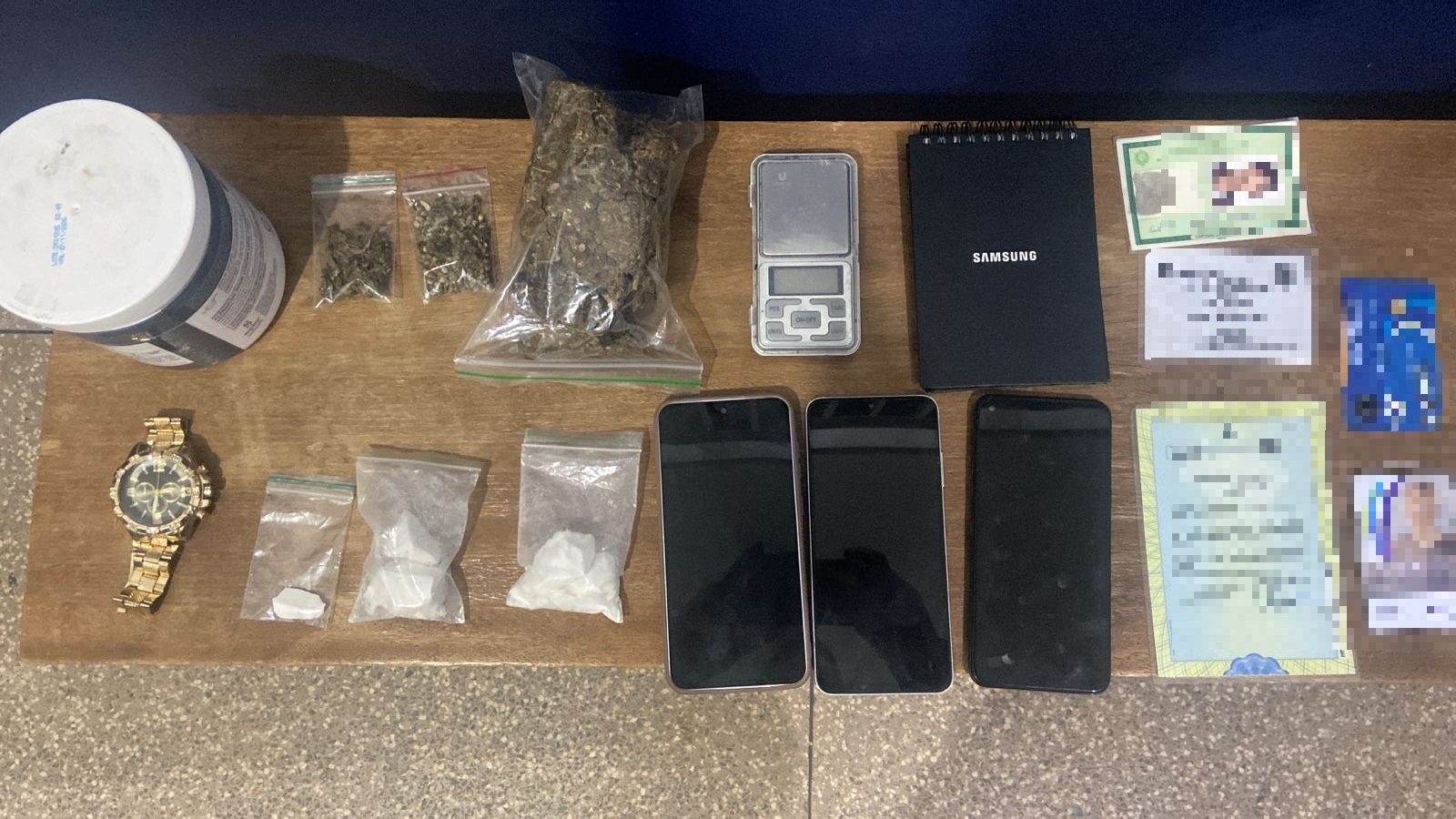 No imóvel, os policiais militares constataram a situação de flagrante delito referente à guarda e depósito de entorpcecentes, porém, “Professor” não foi localizado no local durante a averiguação. No interior do imóvel, a polícia apreendeu aproximadamente 50 gramas de cocaína, cerca de 200 gramas de maconha, uma mini balança digital, um caderno de anotações com registros típicos da contabilidade do tráfico e aparelhos celulares. Os entorpecentes estavam escondidos dentro de um guarda-roupa, enquanto os demais materiais estavam dispostos em um rack na sala, evidenciando uma estrutura organizada para o comércio de drogas.