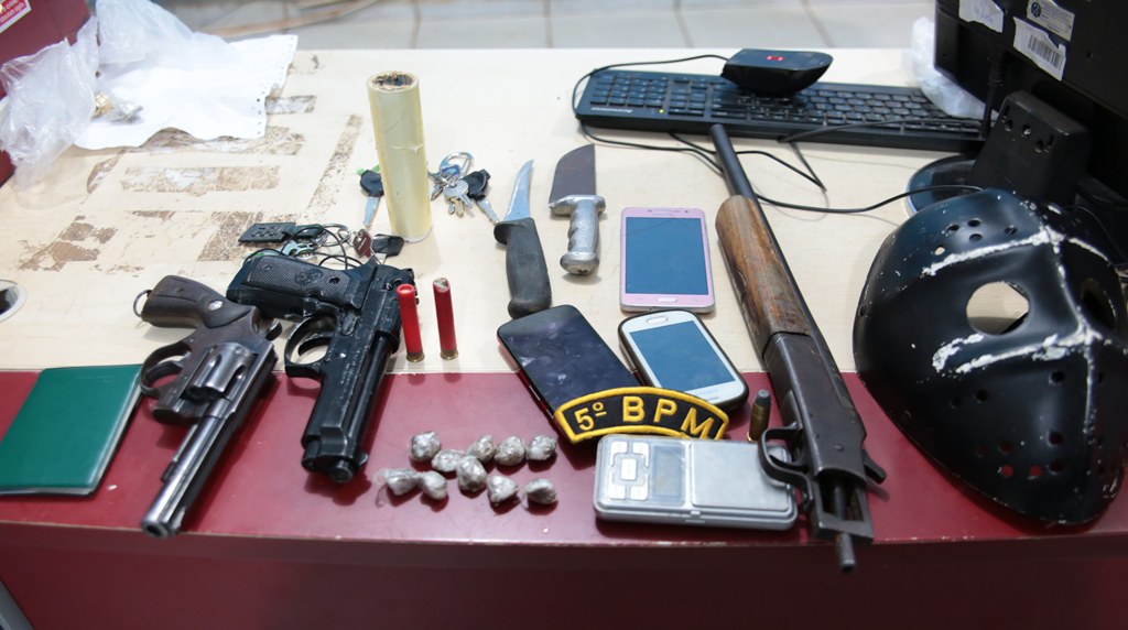 Dentro do imóvel estavam mais três pessoas, entre elas duas mulheres que confessaram serem as proprietárias da boca de fumo. Dentro do apartamento, a PM encontrou vários invólucros de drogas, duas armas de fogo calibres 38 e 44, munições calibre 36, um simulacro de pistola, máscaras e armas artesanais.