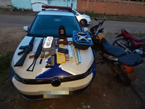 Além das drogas, a equipe localizou um fuzil calibre .22 com carregador e 40 munições, duas réplicas de fuzil, duas placas furtadas de um veículo VW/Voyage branco e uma motocicleta Honda XRE amarela, sem placa aparente, com sinais de adulteração. Após consulta pelo chassi, foi constatado que o veículo possuía restrição de roubo/furto registrada no dia 22 de fevereiro de 2026.