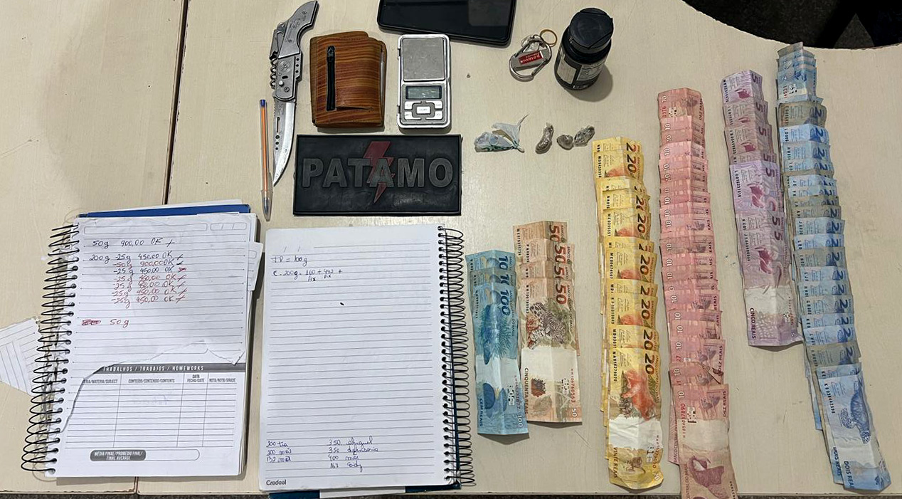 Em diligência no imóvel, os militares localizaram, duas porções de substância análoga à maconha e uma balança de precisão. Também foram apreendidos cadernos com anotações relacionadas à comercialização de drogas. Ainda durante as buscas, foi encontrado o valor de R$ 1.101,00 em espécie, oculto em local inusitado, com características típicas do comércio ilícito.