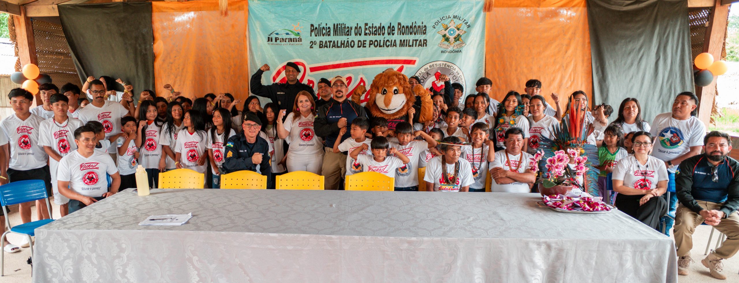 A Polícia Militar de Rondônia, por meio do Programa Educacional de Resistência às Drogas e à Violência (PROERD), realizou na manhã da última quinta-feira, 18, a formatura de mais de 200 alunos pertencentes às aldeias dos povos originários Gavião e Arara, localizadas no distrito de Nova Colina, município de Ji-Paraná. A solenidade marcou a conclusão do curso aplicado em três aldeias da região e simbolizou o fortalecimento da educação preventiva como instrumento de transformação social.