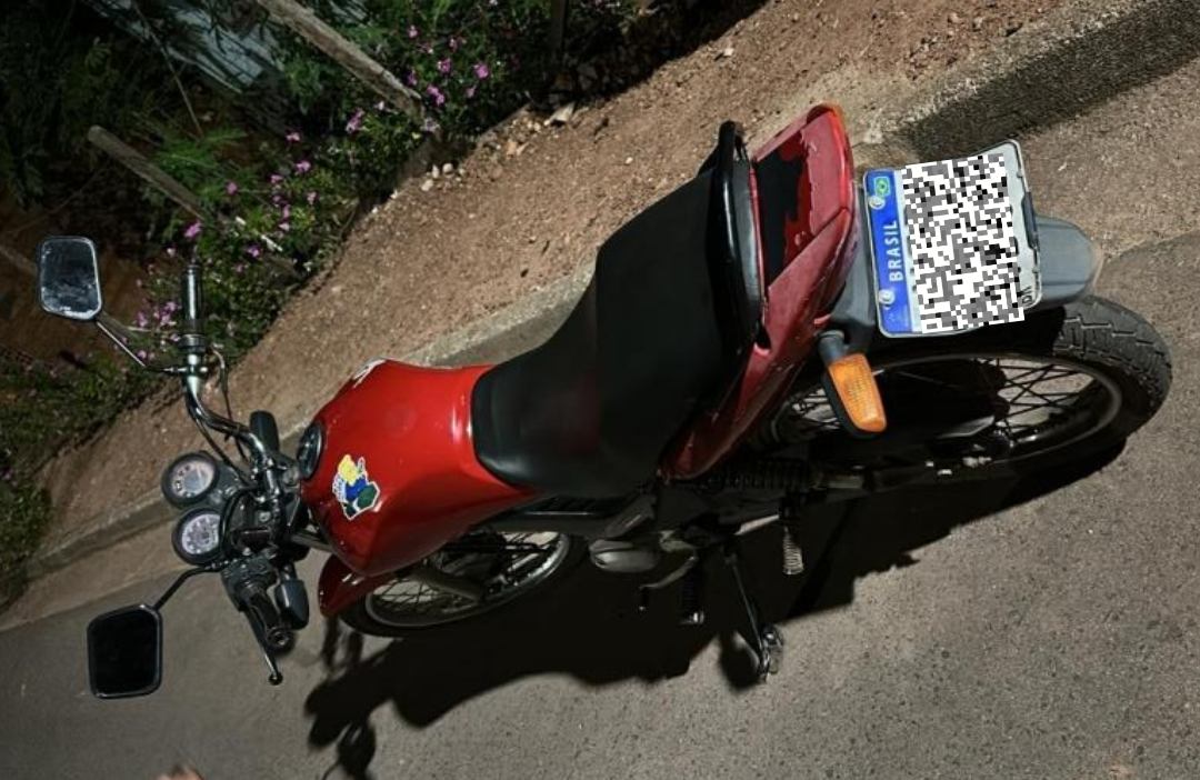 A motocicleta apresentava avarias visíveis, como a placa entortada e danos no tanque, o que pode indicar tentativa de dificultar a identificação. Próximo ao veículo foram encontrados um capacete em mau estado e uma camiseta azul com características semelhantes às roupas usadas pelo autor do furto, conforme imagens analisadas pela polícia.