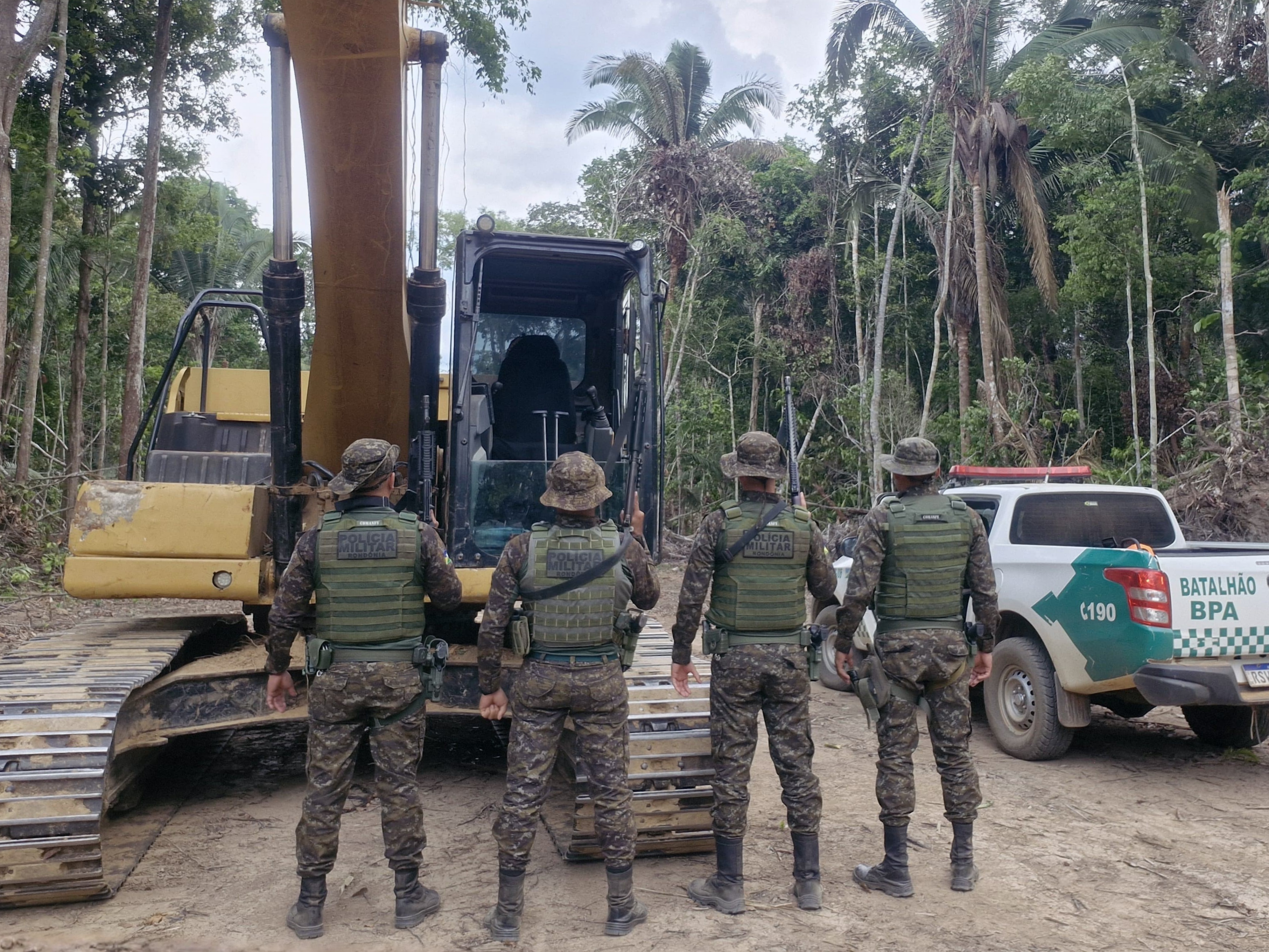 Entre os materiais apreendidos, destacam-se 05 tratores, 05 caminhões, motocicletas, madeiras diversas, munições, uma arma de fogo e um equipamento de comunicação Starlink, utilizado pelos infratores para facilitar a comunicação em áreas de difícil acesso.