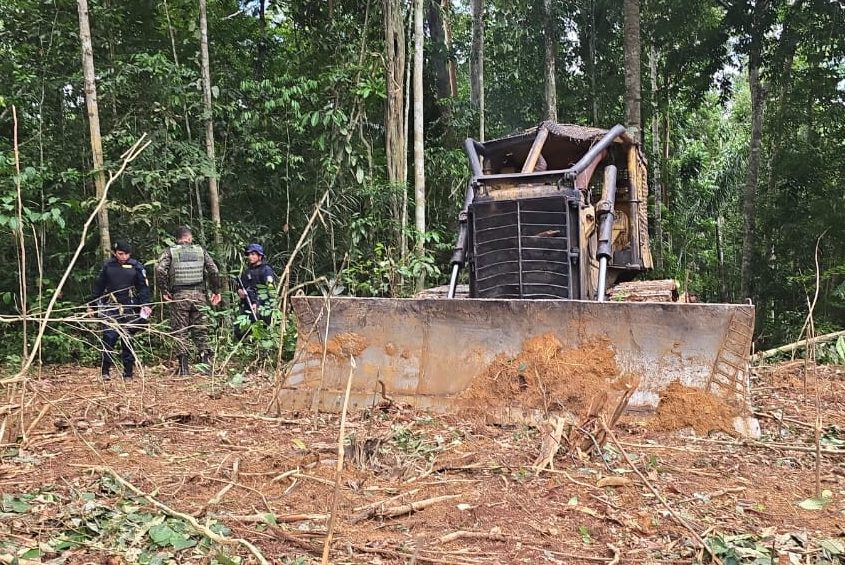 Ao chegar ao local indicado, as guarnições identificaram vestígios de supressão de vegetação nativa e, após adentrarem a área de mata com apoio da equipe comandada pelo Sargento Diego, localizaram um trator de esteiras marca Caterpillar, avaliado em aproximadamente R$ 220 mil, que estava sendo utilizado na abertura da área.