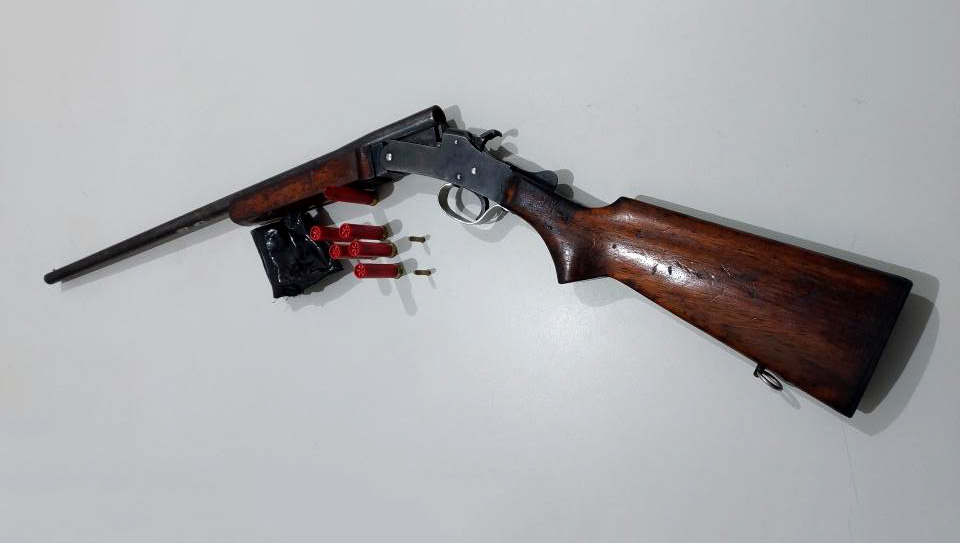 Nas proximidades, os policiais localizaram uma carabina calibre 20 de fabricação artesanal, além de uma cápsula deflagrada no quintal da residência. Também foi constatado um orifício no portão compatível com impacto de projétil. No interior do imóvel, a equipe verificou móveis revirados, sendo informado pela mulher que o homem estaria procurando munições durante o desentendimento.