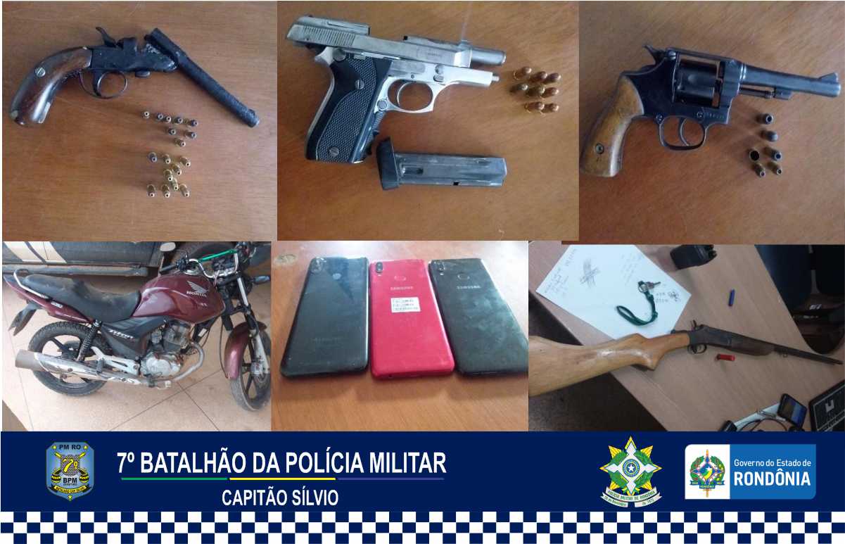 Na tarde de sábado (05/12) policiais militares do 7º Batalhão durante o deslocamento para atenderem uma ocorrência de roubo na área rural, em Cujubim, se depararam com os suspeitos do crime e foram recebidos a tiros. A ação resultou na apreensão de quatro armas de fogo e recuperação de objetos.