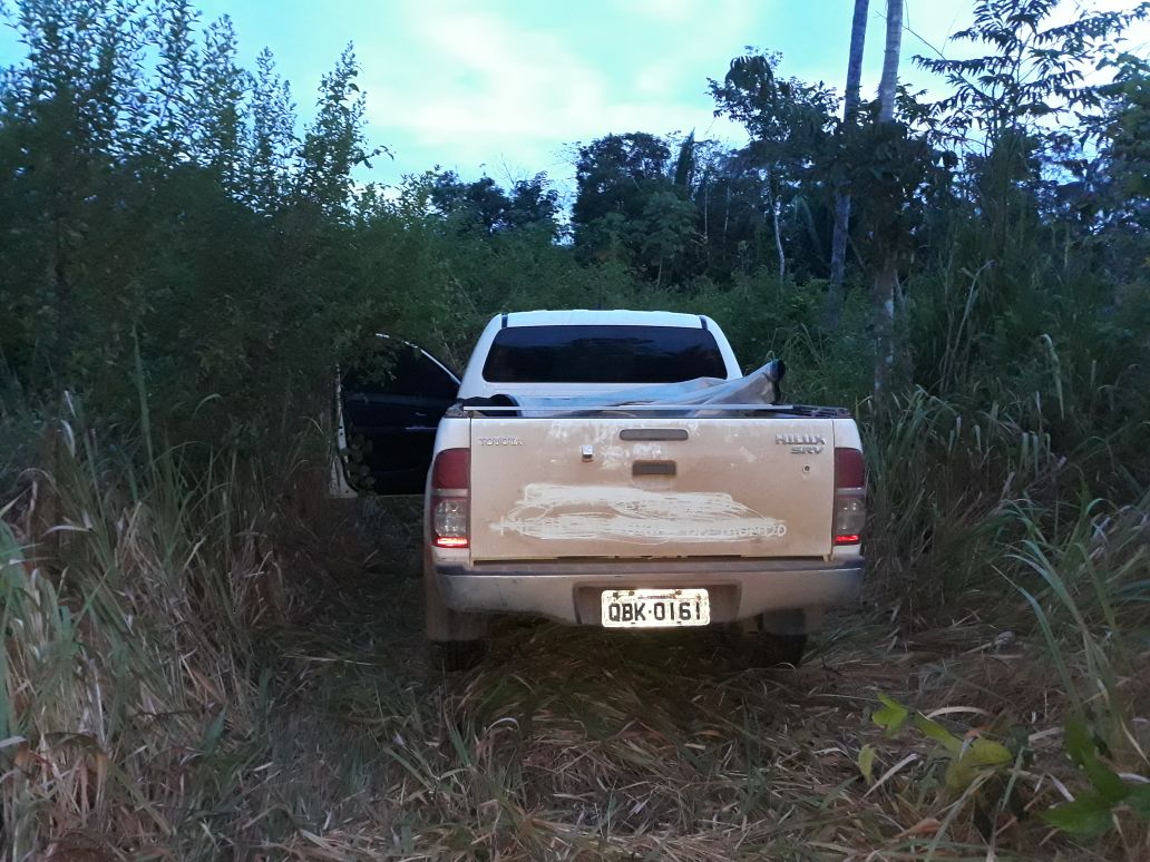 Uma guarnição da PM em patrulhamento no Ramal Lago das Garças no intuito de localizar dois veículos que foram roubados na cidade de Theobroma, após minuciosas diligências, localizou um dos veículos escondido em meio a mata de uma propriedade rural. O veículo, uma caminhonete de marca Toyota, modelo Hillux, de cor Branca e placa QBK 0161 de Theobroma/RO.