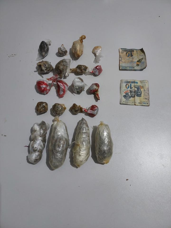 Na busca pessoal, foram encontrados invólucros contendo substâncias aparentando ser maconha e pasta base de crack, parte delas ocultadas junto ao corpo e o restante acondicionado em uma mochila que estava em posse do suspeito. Após a pesagem, foram apreendidos aproximadamente 220 gramas de substância análoga à maconha e 22 gramas de pasta base.
