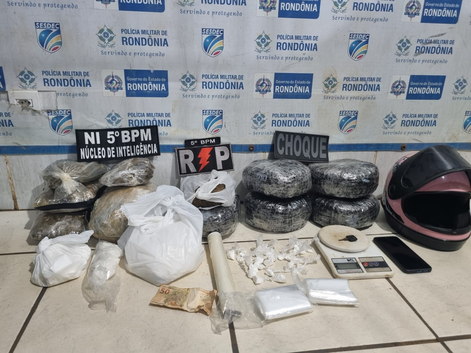 Hoje, 15 de abril de 2025, por volta das 13 horas, policiais militares do 5º Batalhão, com apoio da cadela Duda, do Batalhão de Choque, localizaram cerca de 6 kg de maconha, 2,7 kg de skank e 1,2 kg de pasta base de cocaína na rua Itatiaia, bairro Flamboyant, em Porto Velho, e prenderam um homem acusado de ser o dono da droga.