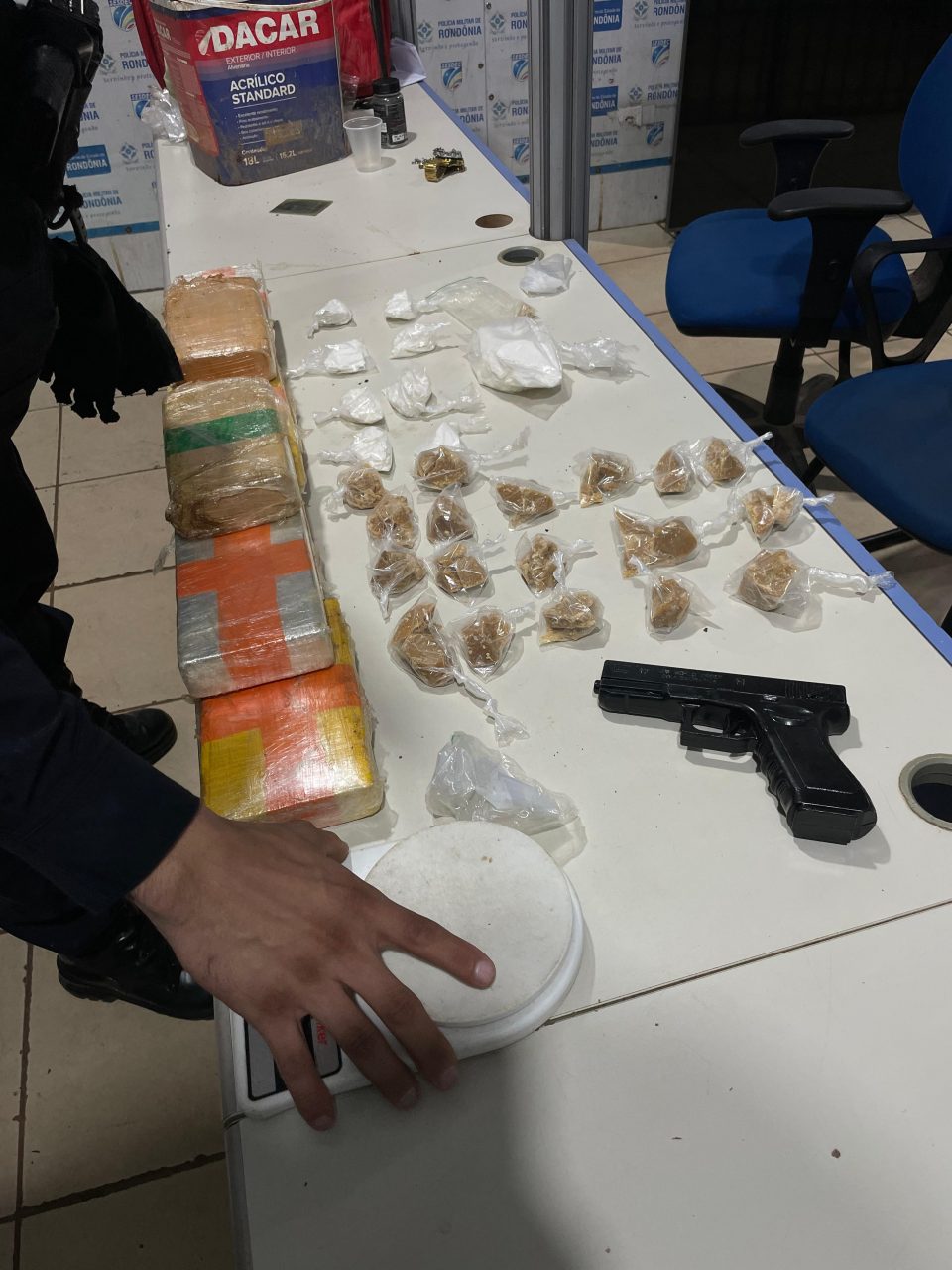 Dentro da residência foram apreendidos ainda 28 invólucros menores contendo drogas fracionadas, além de uma balança de precisão, um simulacro de arma de fogo do tipo pistola e um caderno com anotações que, segundo a polícia, podem estar relacionadas à comercialização de entorpecentes.