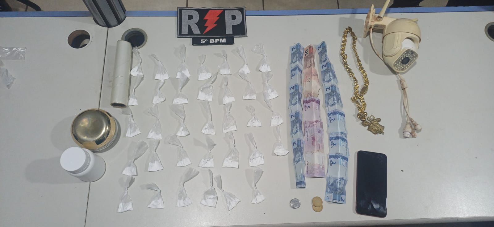 Em continuidade às diligências no local onde o menor havia sido visto inicialmente, os militares encontraram, sobre uma mesa e dentro de um pote, outras 30 porções da mesma substância, dinheiro em cédulas diversas, plásticos utilizados para embalo da droga, uma capa de caderno contendo anotações relacionadas à comercialização ilícita e uma câmera de monitoramento, possivelmente utilizada para vigiar o ponto de venda.
