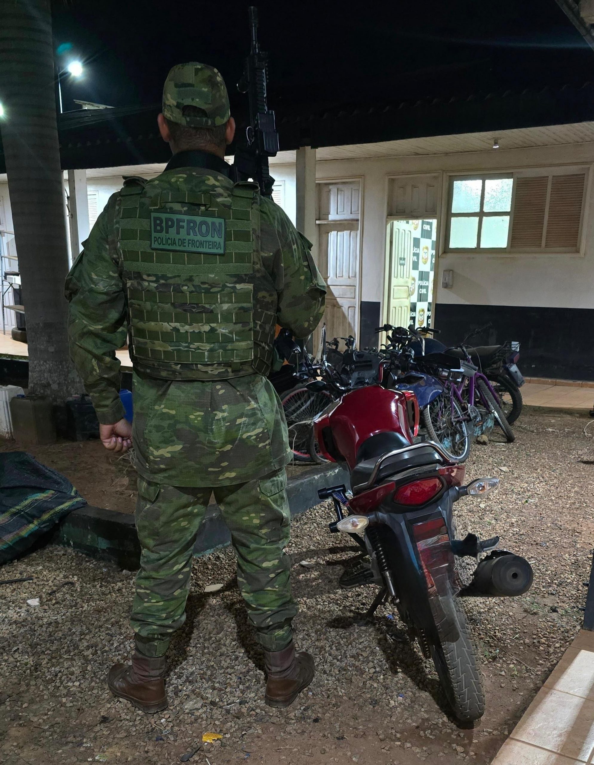 Durante ação da Operação Protetor das Divisas e Fronteiras, a Polícia Militar de Rondônia, por meio do Batalhão de Polícia de Fronteira e Divisas (BPFRON) em conjunto com o Pelotão de Operações com Cães do BPCHOQUE, apreendeu uma motocicleta com sinais de adulteração na cidade de Guajará-Mirim, na fronteira com a Bolívia.