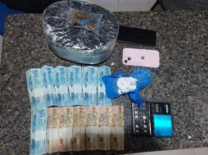 Durante a diligência, os policiais fizeram contato com os moradores do imóvel e informaram sobre o mandado judicial. No decorrer da abordagem e das buscas realizadas na residência, foram localizadas porções de substâncias com características semelhantes à maconha e à cocaína, além de uma balança de precisão, comumente utilizada para pesagem e fracionamento de entorpecentes.