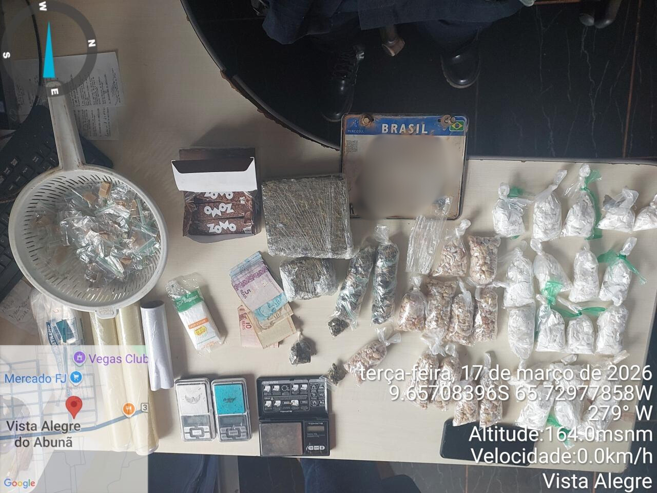 Durante a intervenção policial, foram apreendidas grandes quantidades de substâncias entorpecentes, entre elas porções de crack, cocaína e maconha, todas já fracionadas e prontas para comercialização. Além disso, os policiais localizaram materiais utilizados para preparo e distribuição de drogas, como balanças de precisão, embalagens plásticas e outros apetrechos típicos da atividade ilícita.