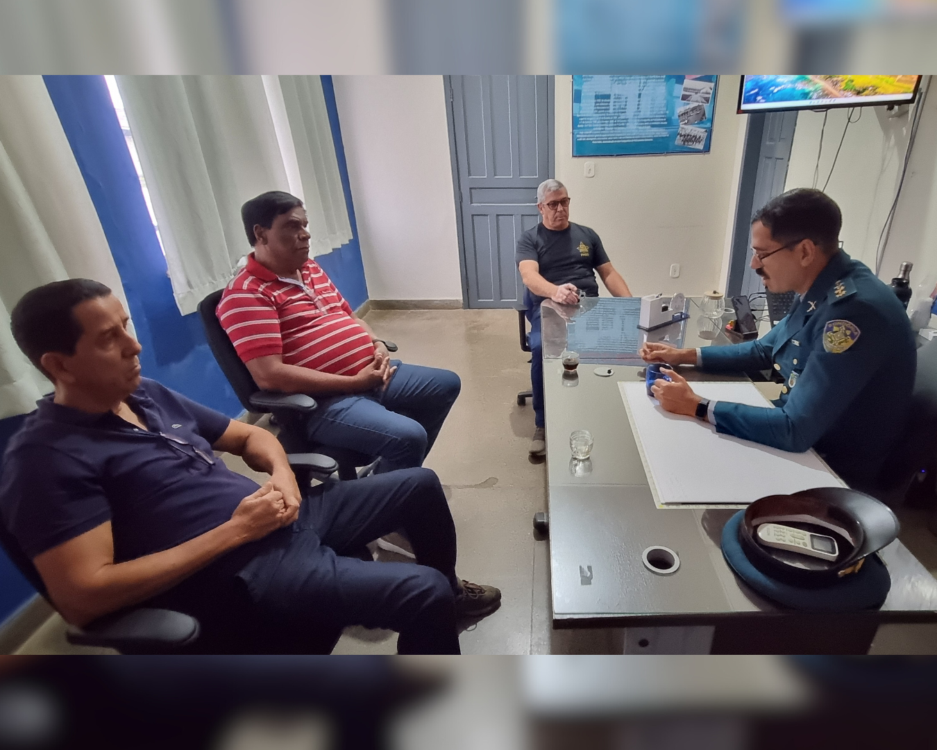 Durante o encontro, os oficiais participaram de um momento de conversa institucional com o Comandante do Batalhão, no qual foram abordados temas relevantes relacionados à atuação da Polícia Militar, ao enfrentamento às facções criminosas, à área de responsabilidade territorial do Primeiro Batalhão, aos programas de patrulhamento e às operações em andamento, com destaque para a Operação Firewall e seus resultados positivos.