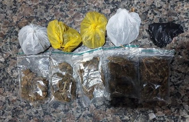 Após abordagem dos demais presentes e buscas no interior do imóvel, foram encontradas 10 porções de substância análoga à maconha, totalizando 65,2 gramas, e 7 porções de substância análoga à cocaína, totalizando 4,9 gramas. Parte da droga estava no chão, onde o suspeito havia jogado o objeto, e o restante foi localizado sobre uma cômoda e na janela do apartamento.
