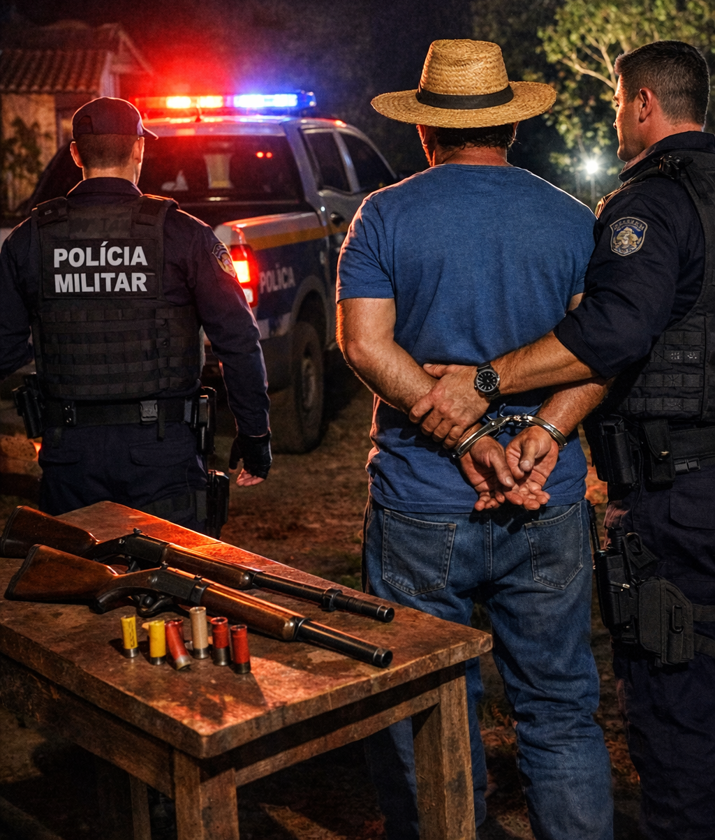 Diante da denúncia, uma guarnição da Polícia Militar, com apoio do Grupo de Policiamento de Novo Plano, deslocou-se até o local indicado. No sítio, os policiais encontraram W., que autorizou a entrada da equipe na residência. Durante as buscas, foram apreendidas duas espingardas calibre .28, além de cartuchos do mesmo calibre, sendo alguns deflagrados e outros intactos, localizados em prateleiras, gavetas e no interior de uma das armas.