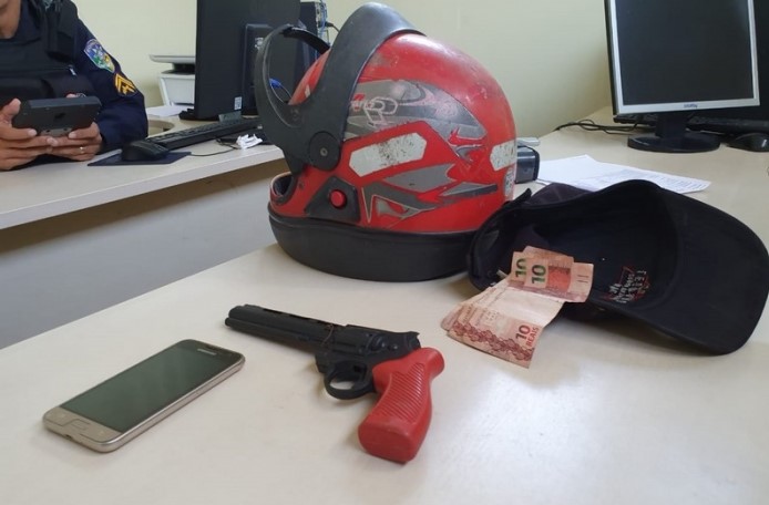 De posse das informações os policiais militares localizaram o veículo, um capacete e um simulacro modelo de um revólver, de cabo vermelho.