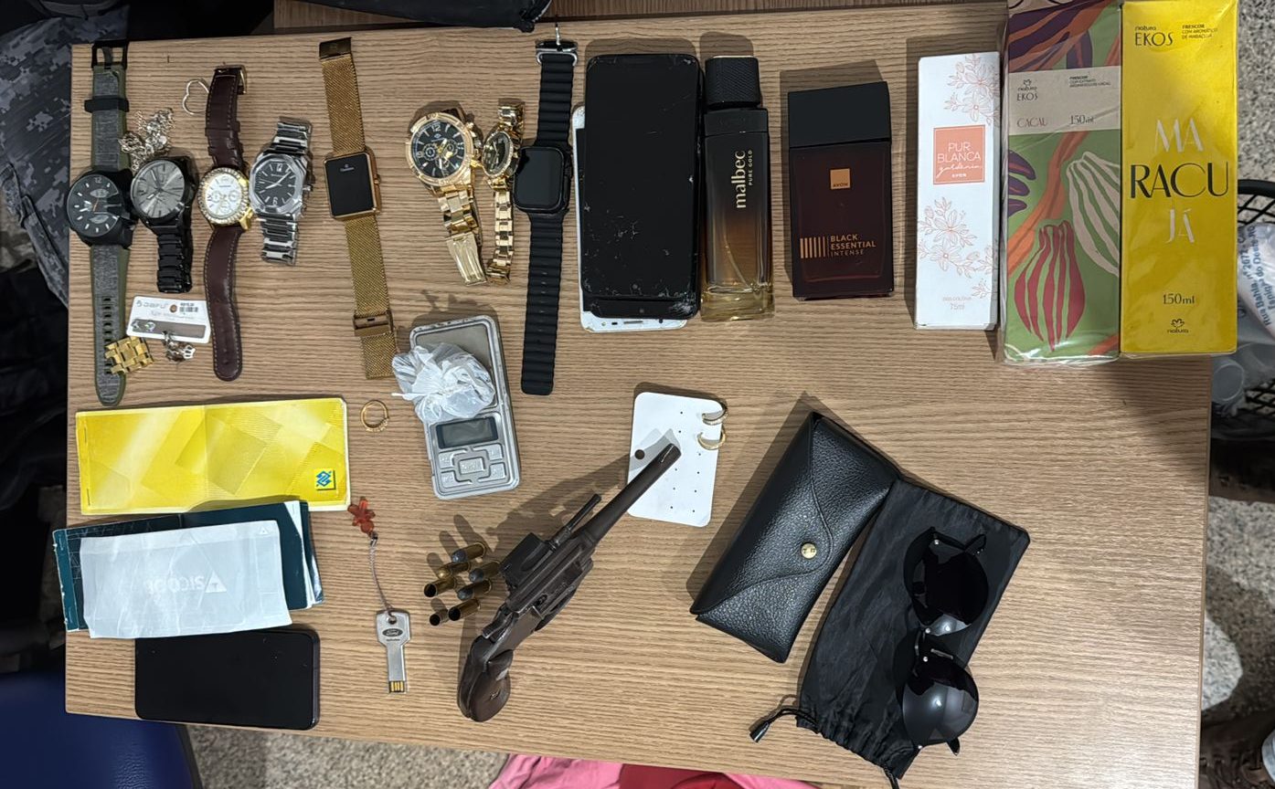 O trabalho de inteligência permitiu, ainda, a identificação de outro endereço onde estavam armazenados bens provenientes de roubos anteriores e outros integrantes da quadrilha. No local, os policiais localizaram relógios, celulares, documentos, cheques, óculos, perfumes, bijuterias, além de uma porção de substância análoga à maconha e uma balança de precisão, indicando que o grupo também atuava no tráfico de drogas.