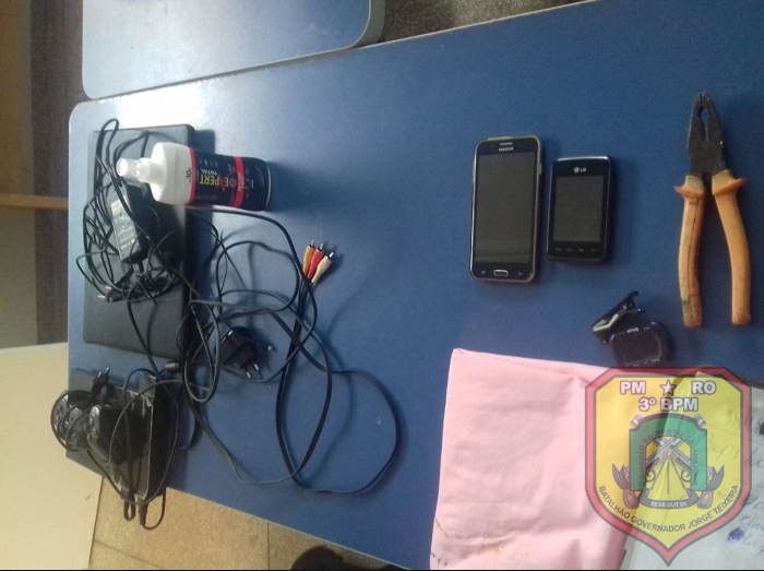 Após denúncia anônima de que um indivíduo carregava um televisor e outros objetos enrolados em lençóis, a guarnição de serviço foi até o local indicado e confirmou o fato.