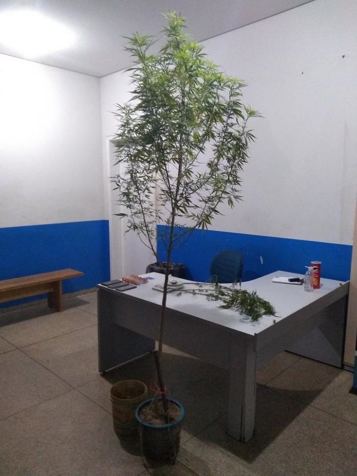 Em revista realizada na casa da suspeita, foi localizada em seu quarto um “pé” de maconha com aproximadamente (02) dois metros de altura plantada em um vaso, e um segundo vaso com outra planta de maconha de porte menor foi localizado no quintal. Em outro cômodo da mesma residência, foi localizada no guarda roupa do padrasto da suspeita uma porção de maconha pesando aproximadamente 14 gramas, mais 3 galhos da mesma substancia, bem como, uma porção de cocaína.